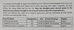इस हादसे के शिकार हुए तीनों लोग अहमदाबाद के सेंट्रल बैंक ऑफ इंडिया में काम करते थे और उज्जैन में बाबा महाकाल के पवित्र तीर्थस्थल की तीर्थयात्रा से लौट रहे थे। हादसा इतना भीषण था कि कार बुरी तरह क्षतिग्रस्त हो गई।